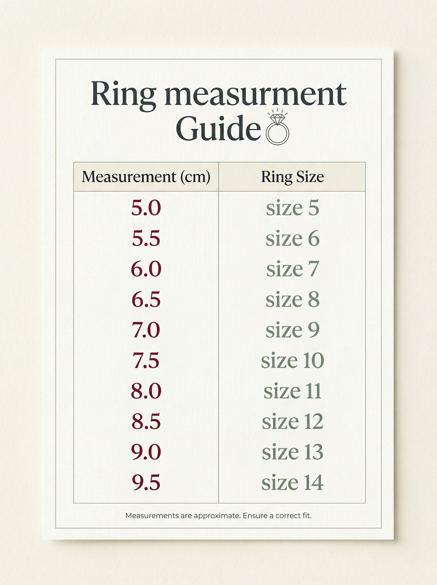 Now, compare your measurement with our Ring Size Chart. For example, if your measurement is 6.0 cm, your ring size is 7. If you are between sizes, we recommend choosing the larger size for a comfortable fit.