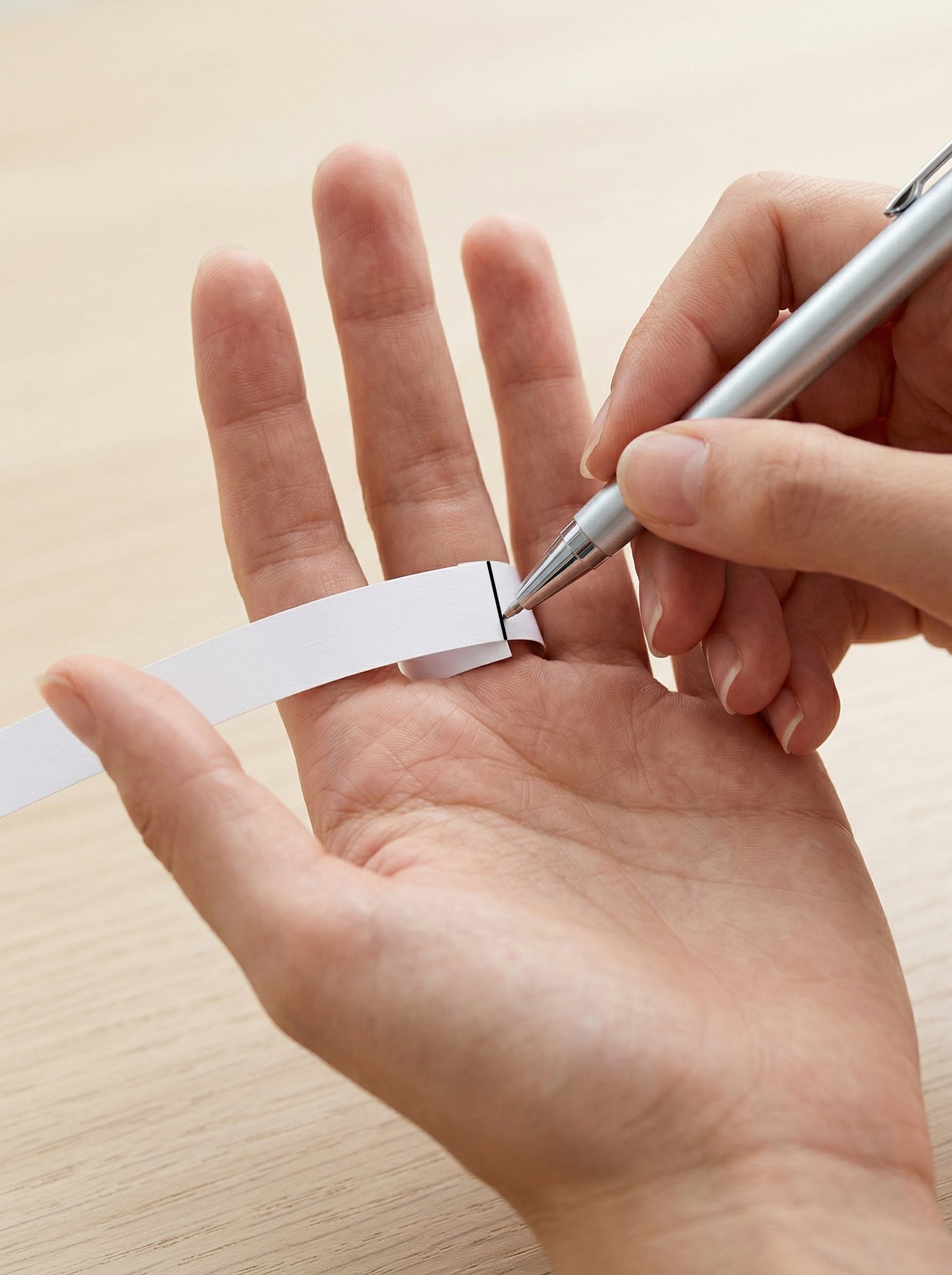 Wrap a thin strip of paper or a string around the base of the finger you want to measure. Use a pen to mark the exact point where the paper overlaps.